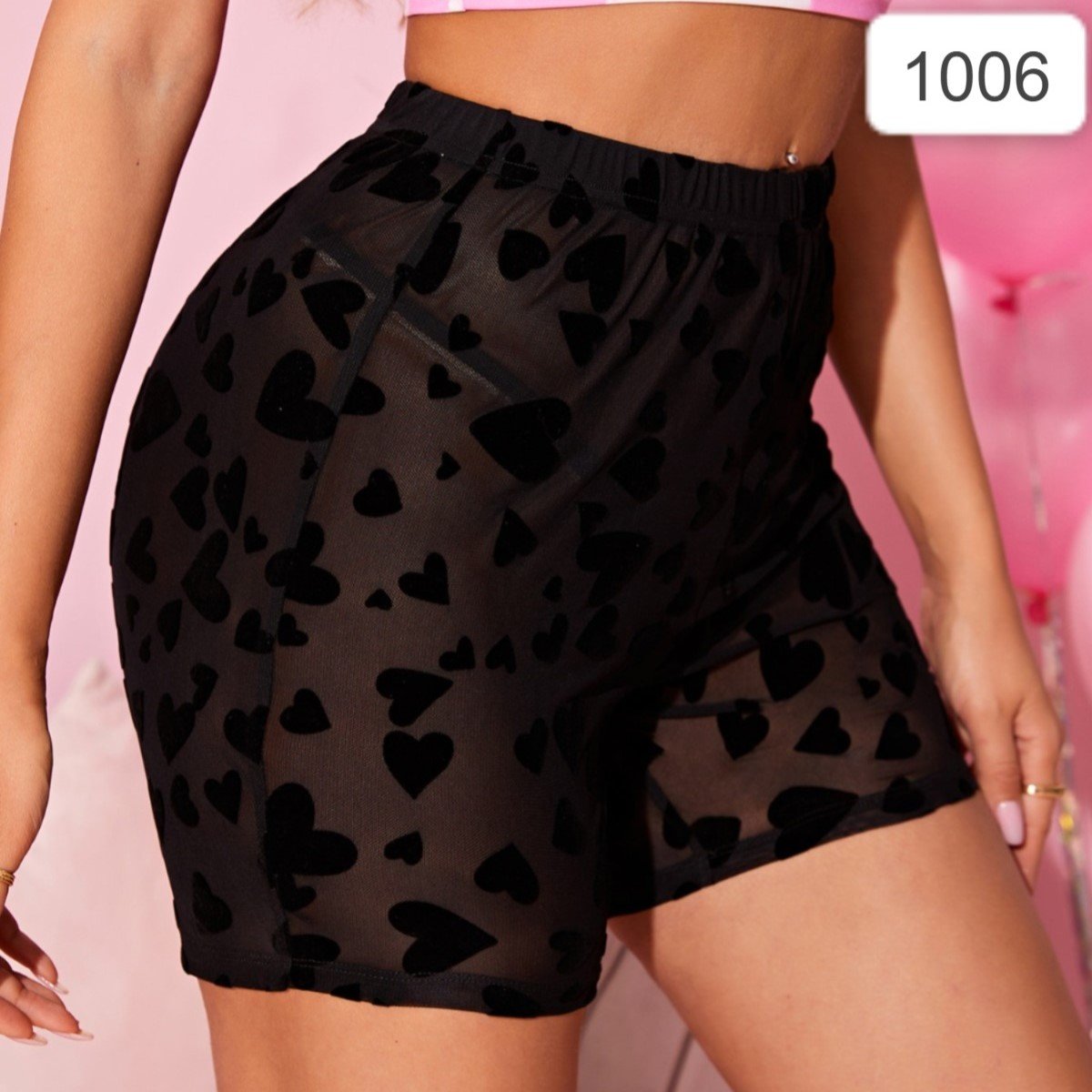 شورتات شبه شفافة بتصميم طباعة قلب وتشطيب بحواف اللاتيس لون اسود القياس لارج