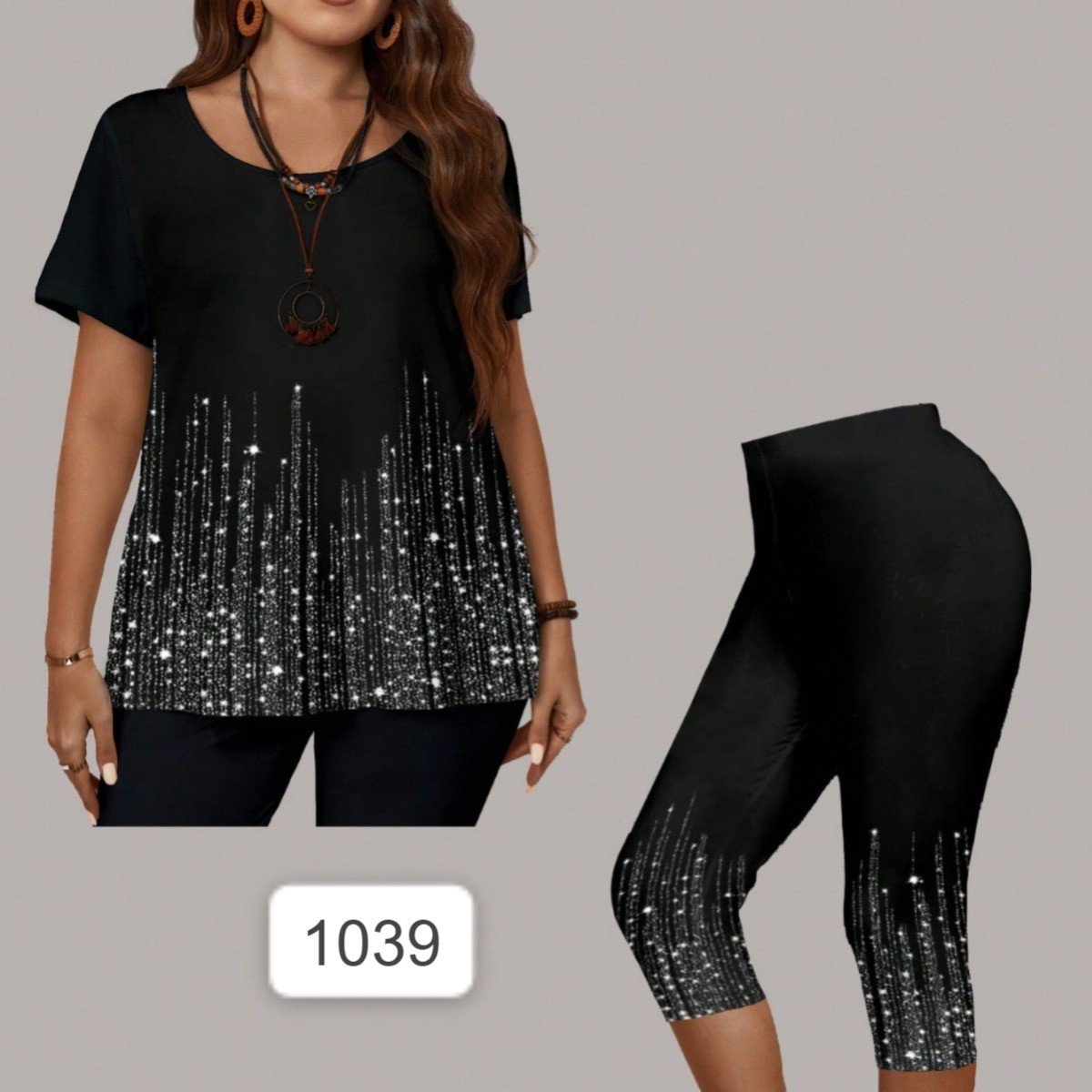 مجموعة تي شيرت ذو اكمام قصيرة مطبوع عليها الراينستون بالأضافة لليقنز لون اسود مناسبة للنساء اللواتي يرتدين مقاسات كبيرة في العطلات و للأوقات الفراغية