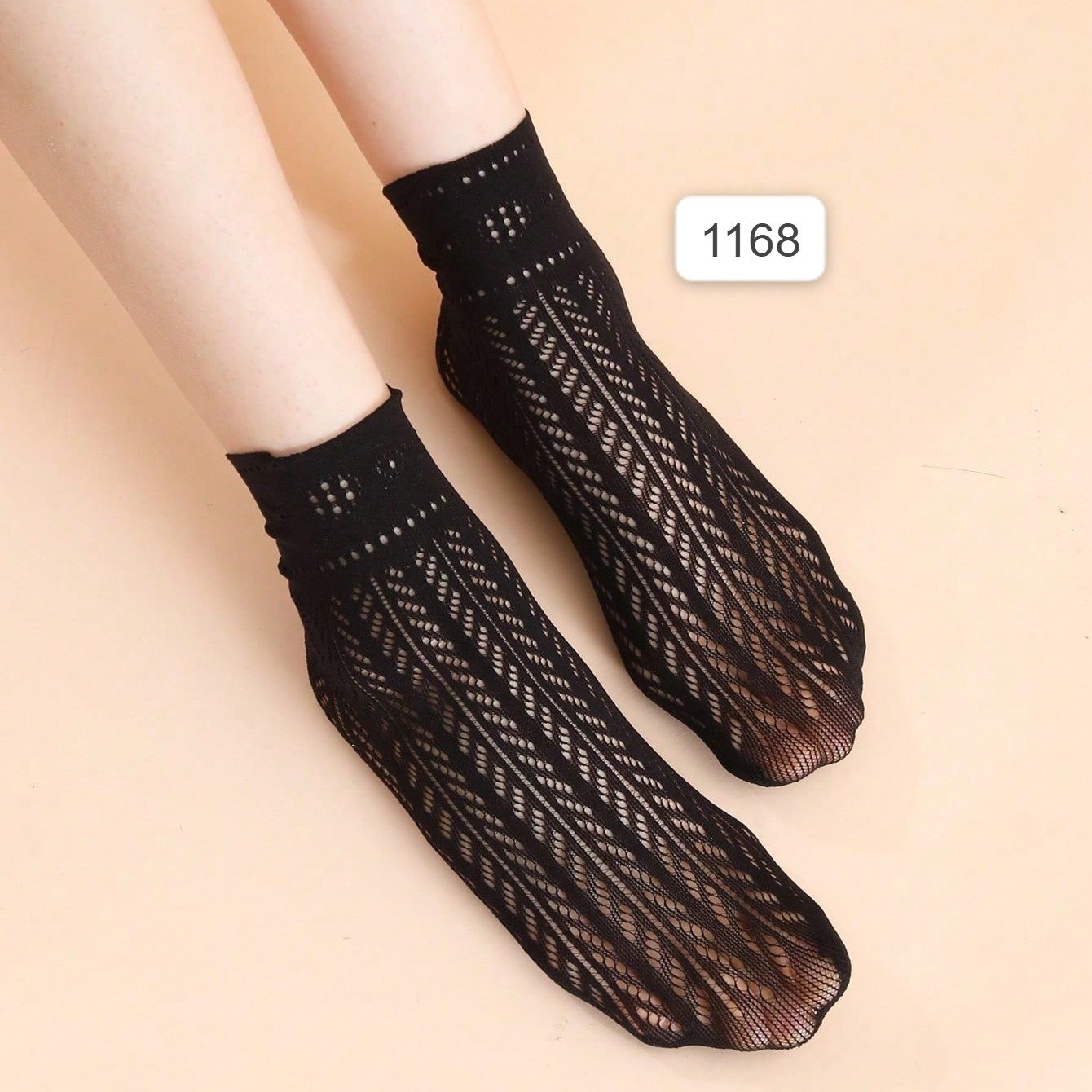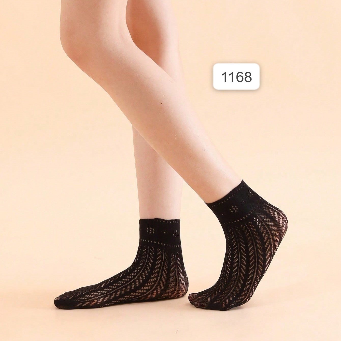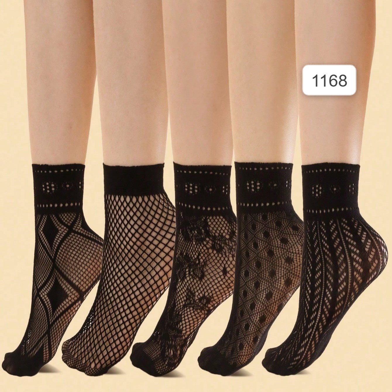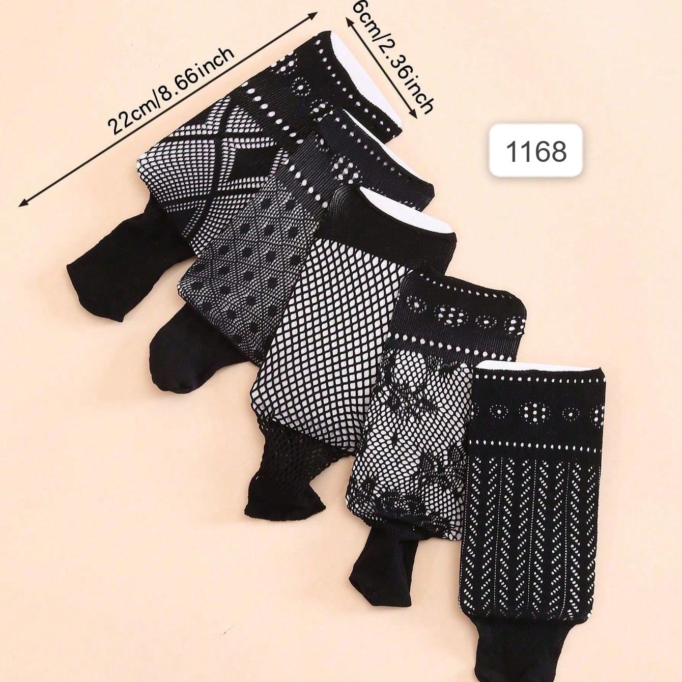 خمس ازواج جوارب شبكية قصيرة بحواف دانتيل للنساء لون الأسود مقاس واحد