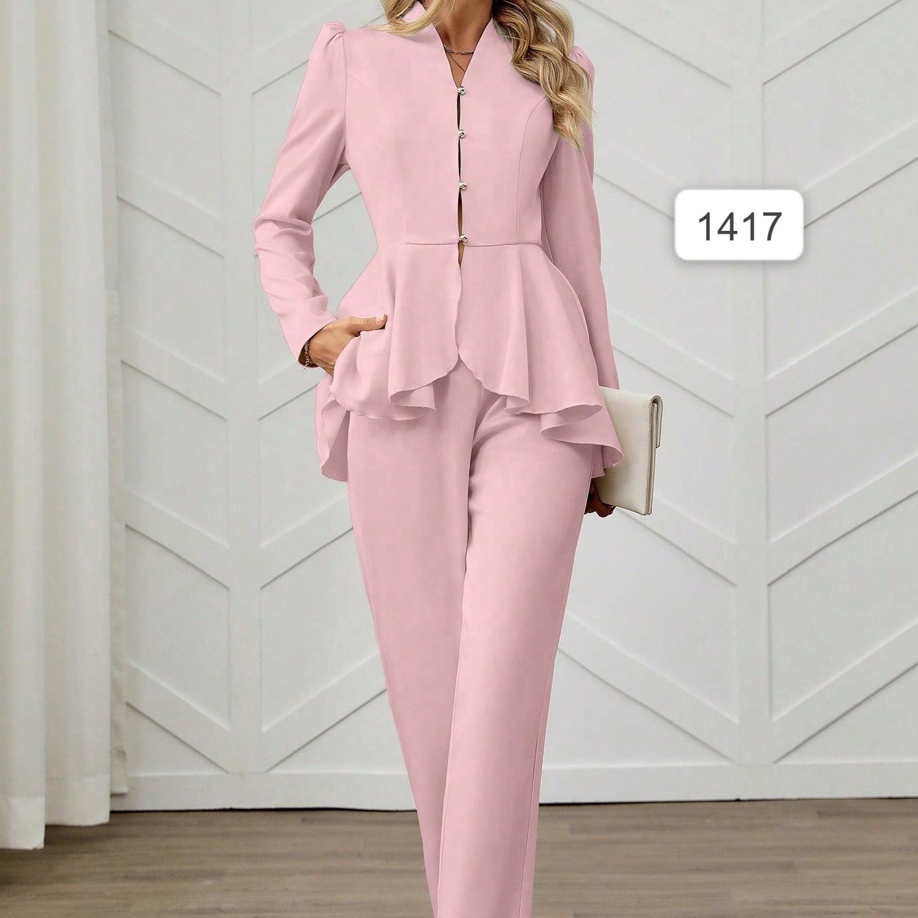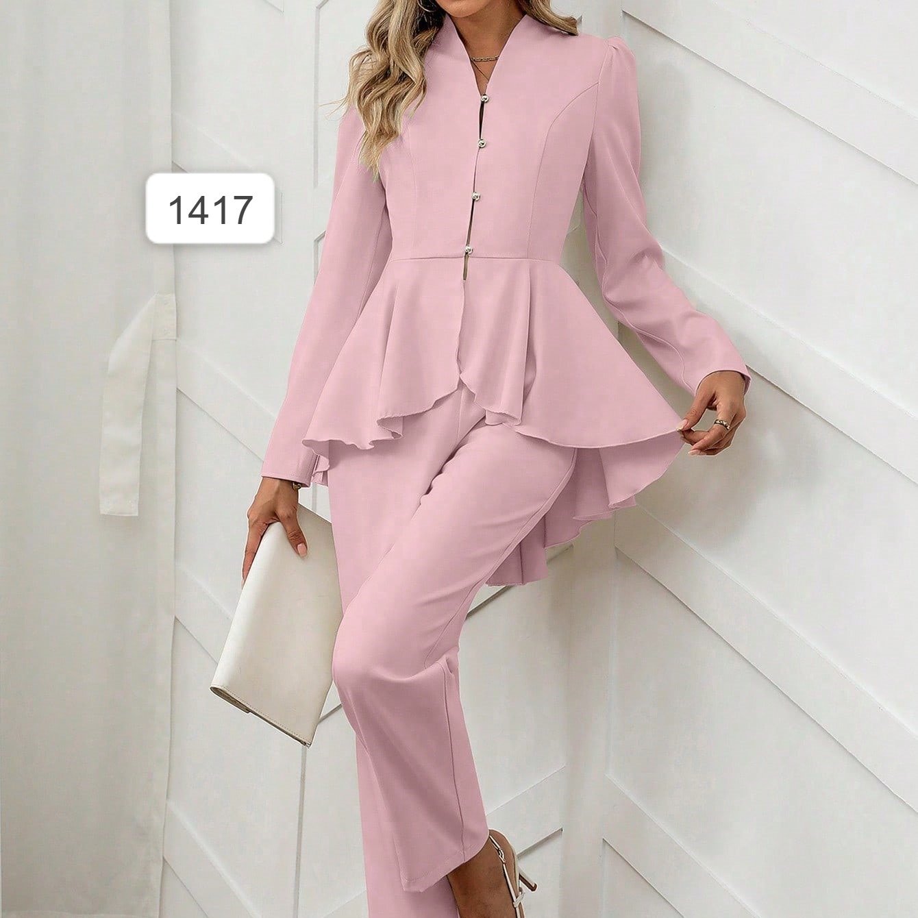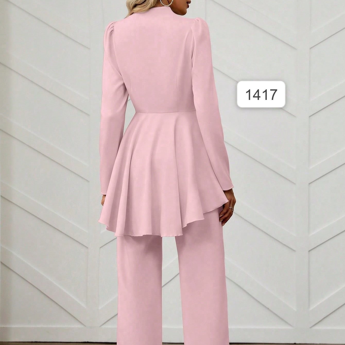 بلوزة رسمي أنيق للنساء بياقة واقفة وأكمام طويلة وتنورة متموجة الذيل